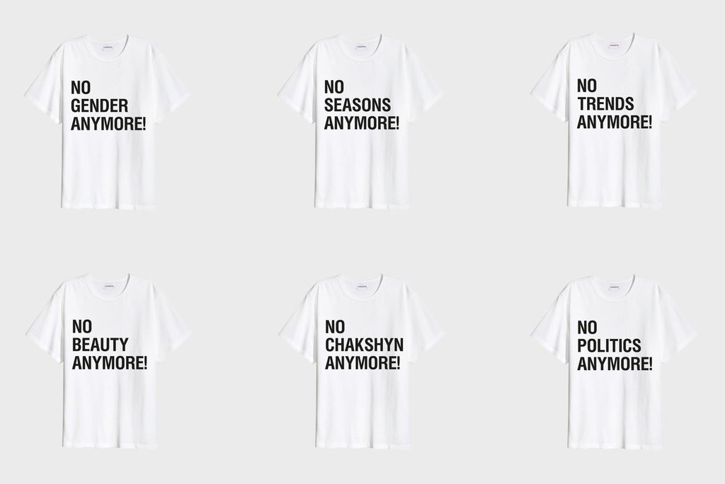 For Spring Summer 2017 collection Chakshyn encouraged to abandon constantly changing rules and expectations of fashion industry, by designing t-shirts with slogans like ‘NO BEAUTY ANYMORE’, ‘NO GENDER ANYMORE’, ‘NO SEASONS ANYMORE’ etc.